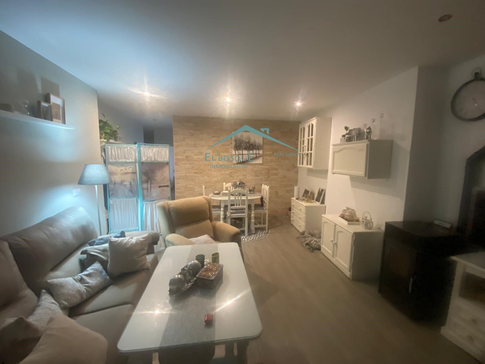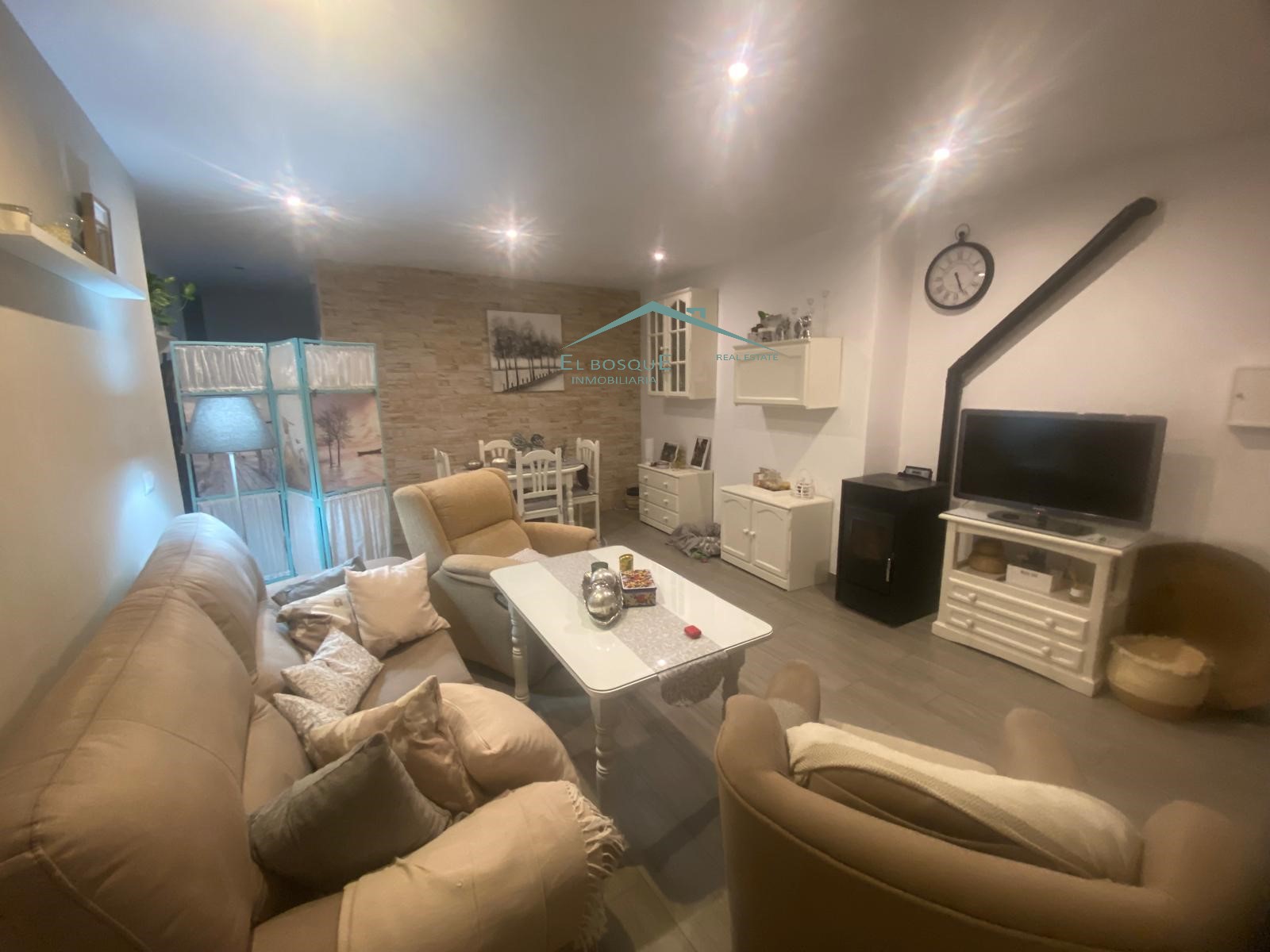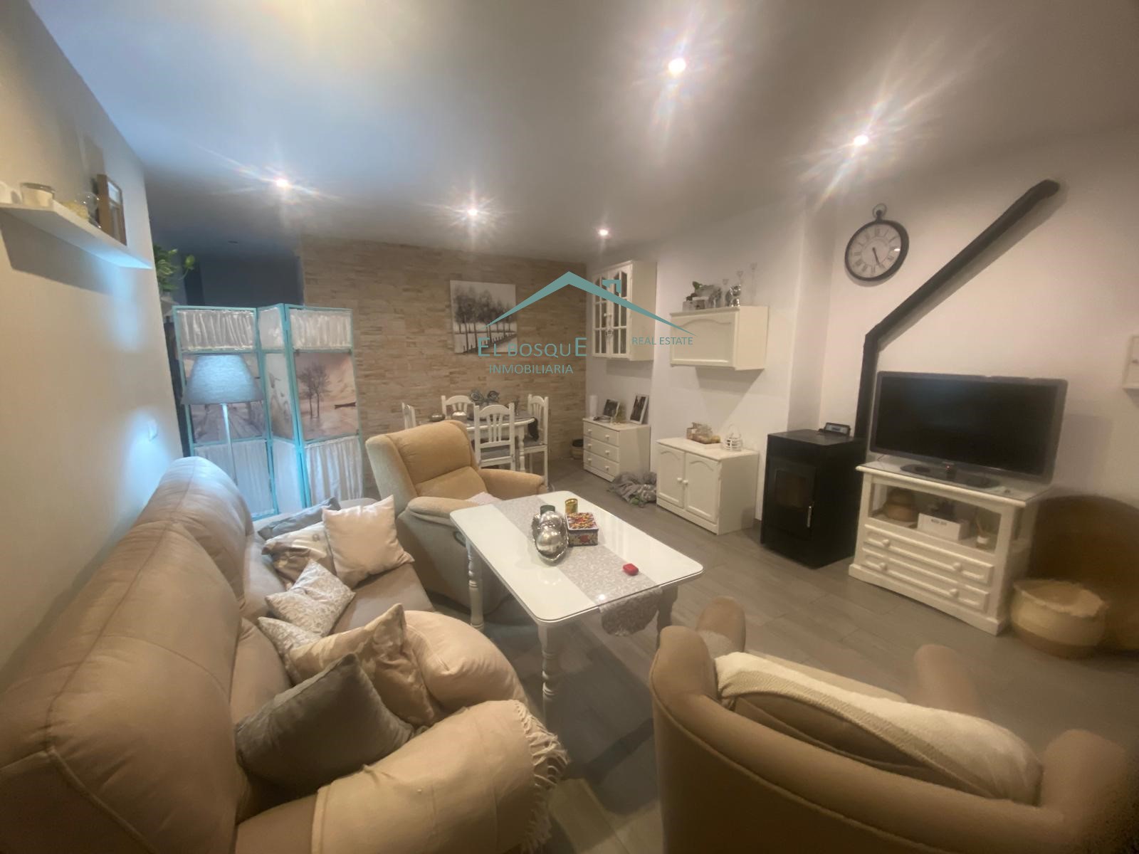 Salón acogedor completamente amueblado, con chimenea.